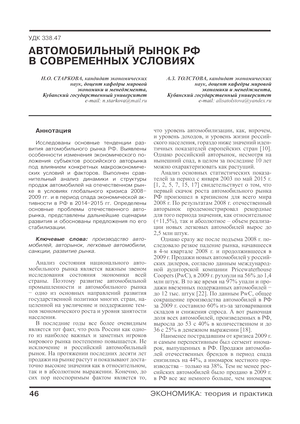 Исследованы основные тенденции развития автомобильного рынка РФ. Выявлены особенности изменения экономического положения субъектов российского авторынка под влиянием конкретных макроэкономических условий и факторов. Выполнен сравнительный анализ динамики и структуры продаж автомобилей на отечественном рынке в условиях глобального кризиса 2008–2009 гг. и в период спада экономической активности в РФ в 2014–2015 гг. Определены основные проблемы отечественного авторынка, представлены дальнейшие сценарии развития и обоснованы предложения по его стабилизации.
