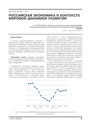 В статье проанализированы текущие и прогнозные тренды развития мировой экономики и ее ключевых игроков. Оценена взаимосвязь внутреннего состояния экономики России со сложившейся геоэкономической и геополитической средой в контексте влияния на динамику экономического развития России.