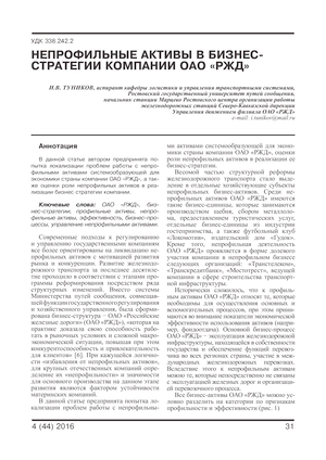 В данной статье автором предпринята попытка локализации проблем работы с непрофильными активами системообразующей для экономики страны компании ОАО «РЖД», а также оценки роли непрофильных активов в реализации бизнес стратегии компании.