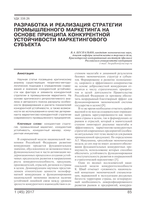Научная статья посвящена критическому анализу существующих теоретико-методологических подходов к определению содержания и значения конкурентной устойчивости как фактора и элемента конкурентной стратегии в промышленном маркетинге. На основе критического ретроспективного анализа и авторского поиска раскрыты особенности формирования и расчета показателей конкурентной устойчивости, а также возможности ее использования в качестве детерминанта маркетингово-конкурентной стратегии современного промышленного предприятия.