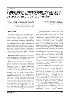 Особенности построения управления персоналом на малых предприятиях сферы общественного питания