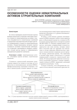 В статье проведена аналитическая оценка выбора наилучшего подхода и методов оценки стоимости нематериальных активов с учетом специфичности строительных компаний и предложен математический аппарат расчета справедливой стоимости нематериальных активов. Охарактеризованы метрики оценки стоимости активов строительной компании, что позволяет менеджменту выбрать наиболее точный метод оценки и сформировать направления развития компании.