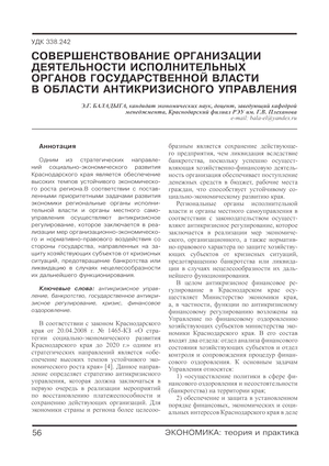Одним из стратегических направлений социально-экономического развития Краснодарского края является обеспечение высоких темпов устойчивого экономического роста региона. В соответствии с поставленными приоритетными задачами развития экономики региональные органы исполнительной власти и органы местного самоуправления осуществляют антикризисное регулирование, которое заключается в реализации мер организационно-экономического и нормативно-правового воздействия со стороны государства, направленных на защиту хозяйствующих субъектов от кризисных ситуаций, предотвращение банкротства или ликвидацию в случаях нецелесообразности их дальнейшего функционирования.