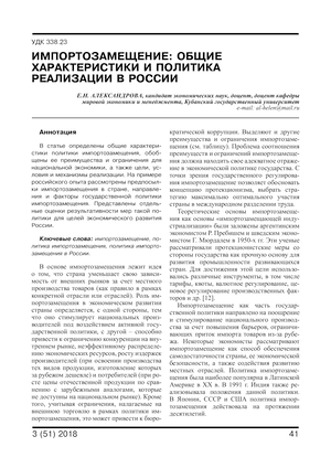 В статье определены общие характеристики политики импортозамещения, обобщены ее преимущества и ограничения для национальной экономики, а также цели, условия и механизмы реализации. На примере российского опыта рассмотрены предпосылки импортозамещения в стране, направления и факторы государственной политики импортозамещения. Представлены отдельные оценки результативности мер такой политики для целей экономического развития России.