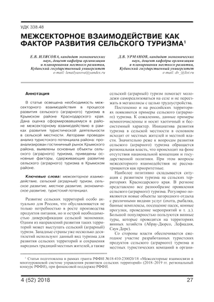 В статье освещена необходимость межсекторного взаимодействия в процессе развития сельского (аграрного) туризма в Крымском районе Краснодарского края. Дана оценка сформировавшемуся в районе межсекторному взаимодействию в рамках развития туристической деятельности в сельской местности. Авторами проведен анализ туристского потенциала района: проанализирован гостиничный рынок Крымского района, выявлены основные объекты сельского (аграрного) туризма, приведены основные факторы, сдерживающие развитие сельского (аграрного) туризма в Крымском районе.