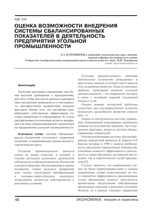 Рыночная экономика предъявляет все более высокие требования к предприятиям, для того чтобы они могли реально оценивать свои внутренние возможности и инструменты противостояния воздействию внешних факторов. Кроме того, это заставляет разрабатывать собственную эффективную систему управления и планирования. В статье рассматриваются ключевые аспекты внедрения системы сбалансированных показателей на предприятиях угольной промышленности.