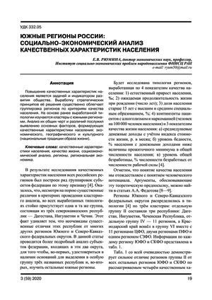 Повышение качественных характеристик населения является задачей и индикатором развития общества. Выработку стратегических принципов ее решения существенно облегчает группировка регионов по критериям качества населения. На основе ранее выработанной типологии изучаются кластеры с южными регионами. Анализ их общих черт и различий послужил выявлению основных факторов, формирующих качественные характеристики населения: экономического, географического и культурного (национальные традиции образа жизни).