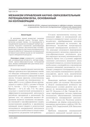 9. Пономарева О.Н. Оценка инновационной активности учреждений высшего образования г. Екатеринбурга с целью совершенствования системы управления научно-образовательным потенциалом вуза // Экономика и предпринимательство. 2016. № 9. С. 506—516.