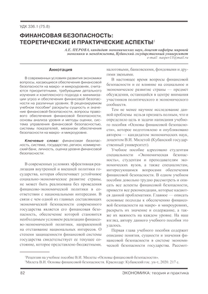 В современных условиях развития экономики вопросы, касающиеся обеспечения финансовой безопасности на макро- и микроуровнях, считаются приоритетными, требующими детального изучения и комплексного подхода к минимизации угроз и обеспечения финансовой безопасности на различных уровнях. В рецензируемом учебном пособии² раскрыты сущность и значение финансовой безопасности, вопросы правового обеспечения финансовой безопасности, основы анализа уровня и методы оценки, система управления финансовой безопасностью, системы показателей, механизм обеспечения безопасности на макро- и микроуровне.