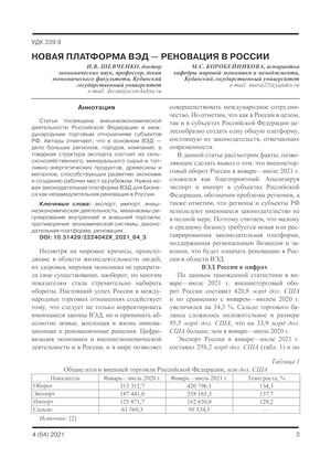Статья посвящена внешнеэкономической деятельности Российской Федерации и международным торговым отношениям субъектов РФ. Авторы отмечают, что в основном ВЭД — дело больших регионов, городов, компаний, а товарная структура экспорта состоит из сельскохозяйственного, минерального сырья и топливно-энергетических продуктов, древесины и металлов, способствующих развитию экономик и созданию рабочих мест за рубежом. Нужна новая законодательная платформа ВЭД для бизнеса как незамедлительная реновация в России.
