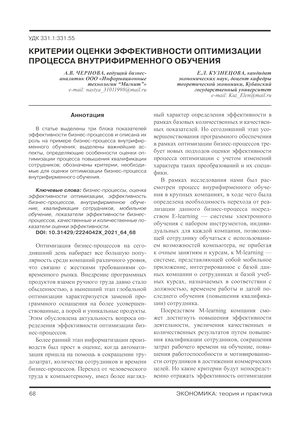 В статье выделены три блока показателей эффективности бизнес-процессов и описана их роль на примере бизнес-процесса внутрифирменного обучения; выделены важнейшие аспекты, определяющие особенности оценки оптимизации процесса повышения квалификации сотрудников; обозначены критерии, необходимые для оценки оптимизации бизнес-процесса внутрифирменного обучения.