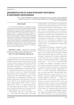 В статье рассматриваются драйверы развития электронной торговли в мировой экономике. Современный вектор развития данной отрасли значительно изменился под воздействием пандемии Covid-19, а дальнейший рост зависит от предпочтений и ожиданий потребителей, внедрения компаниями онлайн-ритейла цифровых технологий, развития соответствующей инфраструктуры, расширения / оптимизации логистического пространства. При развитии указанных драйверов необходимо соблюдать баланс интересов как отдельных стран, так и субъектов внутри страны в сфере потоков данных, их объединении, анализе и обработке.