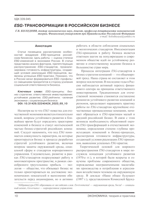 Статья посвящена рассмотрению особенностей внедрения ESG-принципов российским бизнесом. Цель работы — оценка степени ESG-изменений в экономике России. В статье представлен анализ факторов, препятствующих распространению ESG-стандартов, проанализирована готовность инфраструктуры, создающей условия реализации ESG-принципов, выявлены успешные ESG-практики. Показано, что в России начал формироваться ESG-«профиль» со смещением приоритетов в сторону усиления социальной ответственности бизнеса.