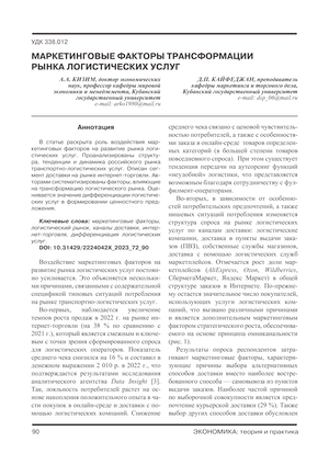В статье раскрыта роль воздействия маркетинговых факторов на развитие рынка логистических услуг. Проанализированы структура, тенденции и динамика российского рынка транспортно-логистических услуг. Описан сегмент доставки на рынке интернет-торговли. Авторами систематизированы факторы, влияющие на трансформацию логистического рынка. Оценивается значение дифференциации логистических услуг в формировании ценностного предложения.