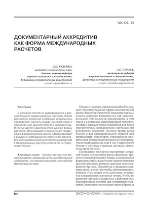 В условиях постоянно развивающихся и расширяющихся международных торговых связей российских компаний особую актуальность приобретают расчеты между контрагентами с применением документарного аккредитива. В статье дается характеристика данной формы расчетов, обосновывается важность ее продвижения в российской экономике. Авторы приходят к выводу о необходимости увеличения масштабов использования документарного аккредитива в международных расчетах, а также в расчетах на территории России.