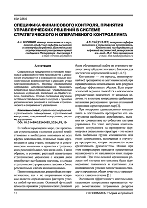 Современные предприятия в условиях перехода к цифровой системе производства и управления сталкиваются с совершенно новыми экономическими возможностями и угрозами утери платежеспособности. Поэтому предприятиям необходимо целеориентированно принимать оперативно-ориентированные управленческие решения и решения, влияющие на стратегические показатели. Статья посвящена изучению особенностей финансового контроля и принятия управленческих решений в системах стратегического и оперативного управления.