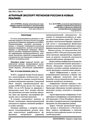 В статье рассматриваются динамика и перспективы аграрного экспорта России в условиях санкционного давления, подведены итоги 2023 г. Проанализированы основные достижения и вызовы, с которыми сталкиваются российские аграрные предприятия, включая логистические барьеры и сертификацию продукции. Обсуждаются ключевые направления развития, такие как цифровизация агропромышленности, улучшение экспортных стратегий и международное сотрудничество для повышения конкурентоспособности на мировом рынке.