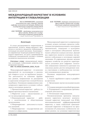 В статье рассматриваются теоретические и практические аспекты международного маркетинга в контексте процессов глобализации и интеграции мировой экономики. Анализируются современные тенденции развития международного маркетинга, его роль в формировании глобальной экономической системы и влияние на развитие национальных экономик.