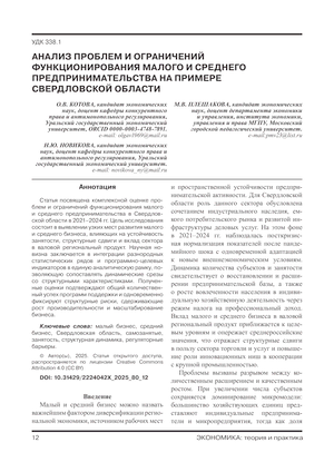 Статья посвящена комплексной оценке проблем и ограничений функционирования малого и среднего предпринимательства в Свердловской области в 2021–2024 гг. Цель исследования состоит в выявлении узких мест развития малого и среднего бизнеса, влияющих на устойчивость занятости, структурные сдвиги и вклад сектора в валовой региональный продукт. Научная новизна заключается в интеграции разнородных статистических рядов и программно-целевых индикаторов в единую аналитическую рамку, позволяющую сопоставлять динамические срезы со структурными характеристиками. Полученные оценки подтверждают общий количественный успех программ поддержки и одновременно фиксируют структурные риски, сдерживающие рост производительности и масштабирование бизнеса.