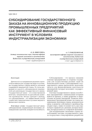 Субсидирование государственного заказа на инновационную продукцию промышленных предприятий как эффективный финансовый инструмент в условиях индустриализации экономики